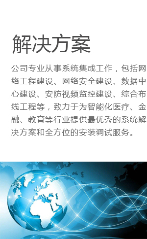 緻力于為(wèi)智能(néng)化(huà)醫(y≠₩ī)療、金(jīn)融、教育等行(xíng)業(yè)提供最優秀的(de)系統解決方案和(hé₩★)全方位的(de)安裝調試服務。